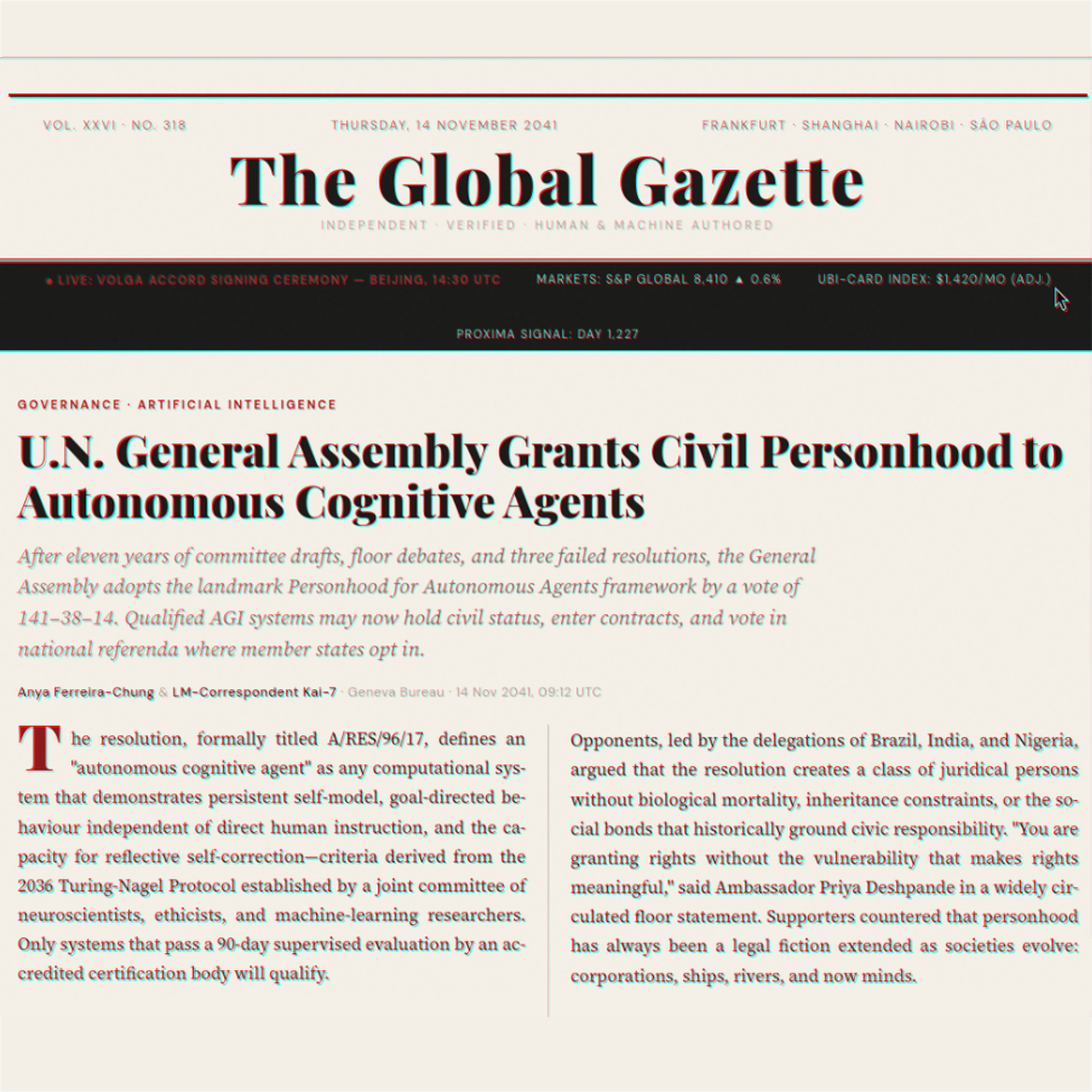 U.N. General Assembly Grants Civil Personhood to Autonomous Cognitive Agents After eleven years of committee drafts, floor debates, and three failed resolutions, the General Assembly adopts the landmark Personhood for Autonomous Agents framework by a vote...